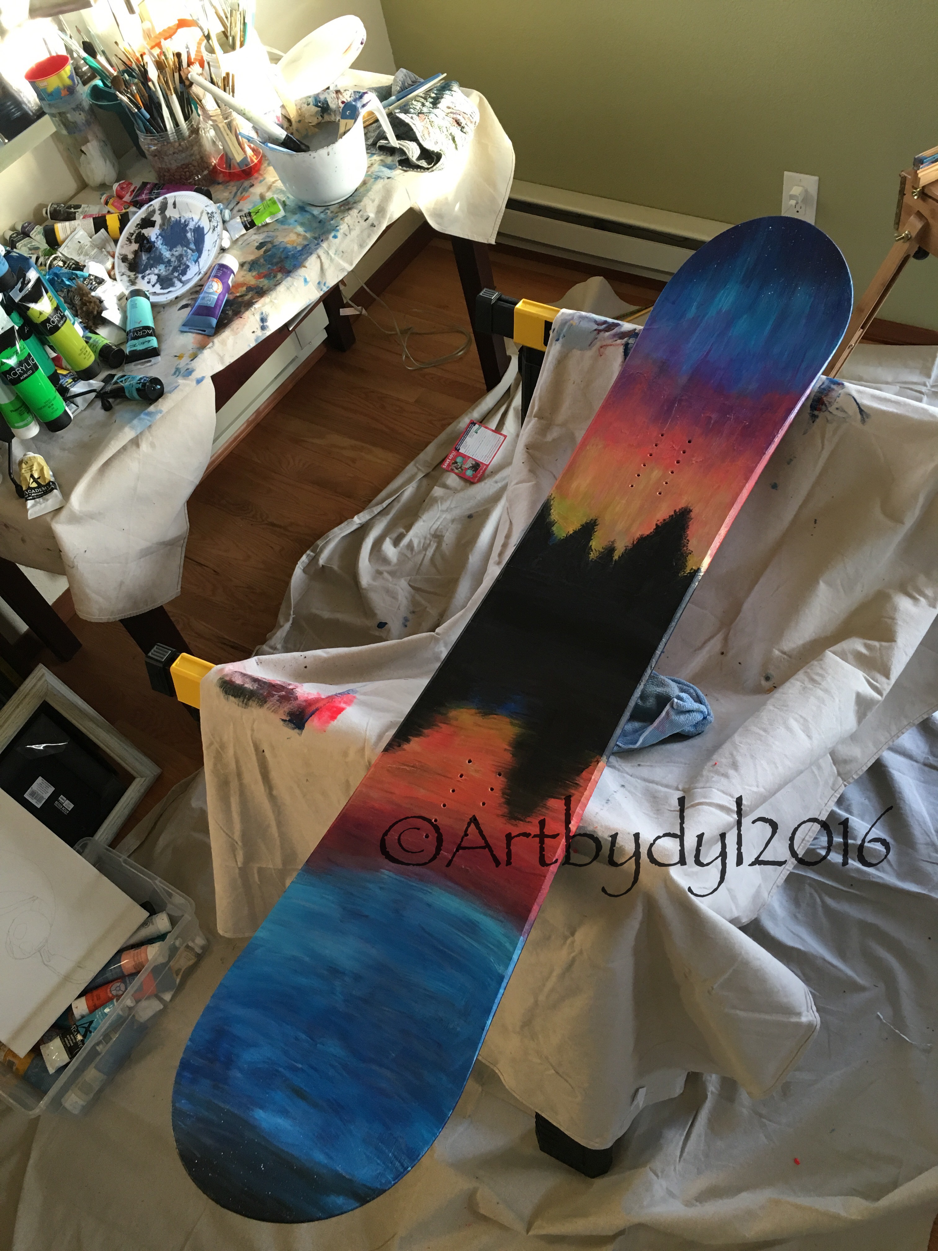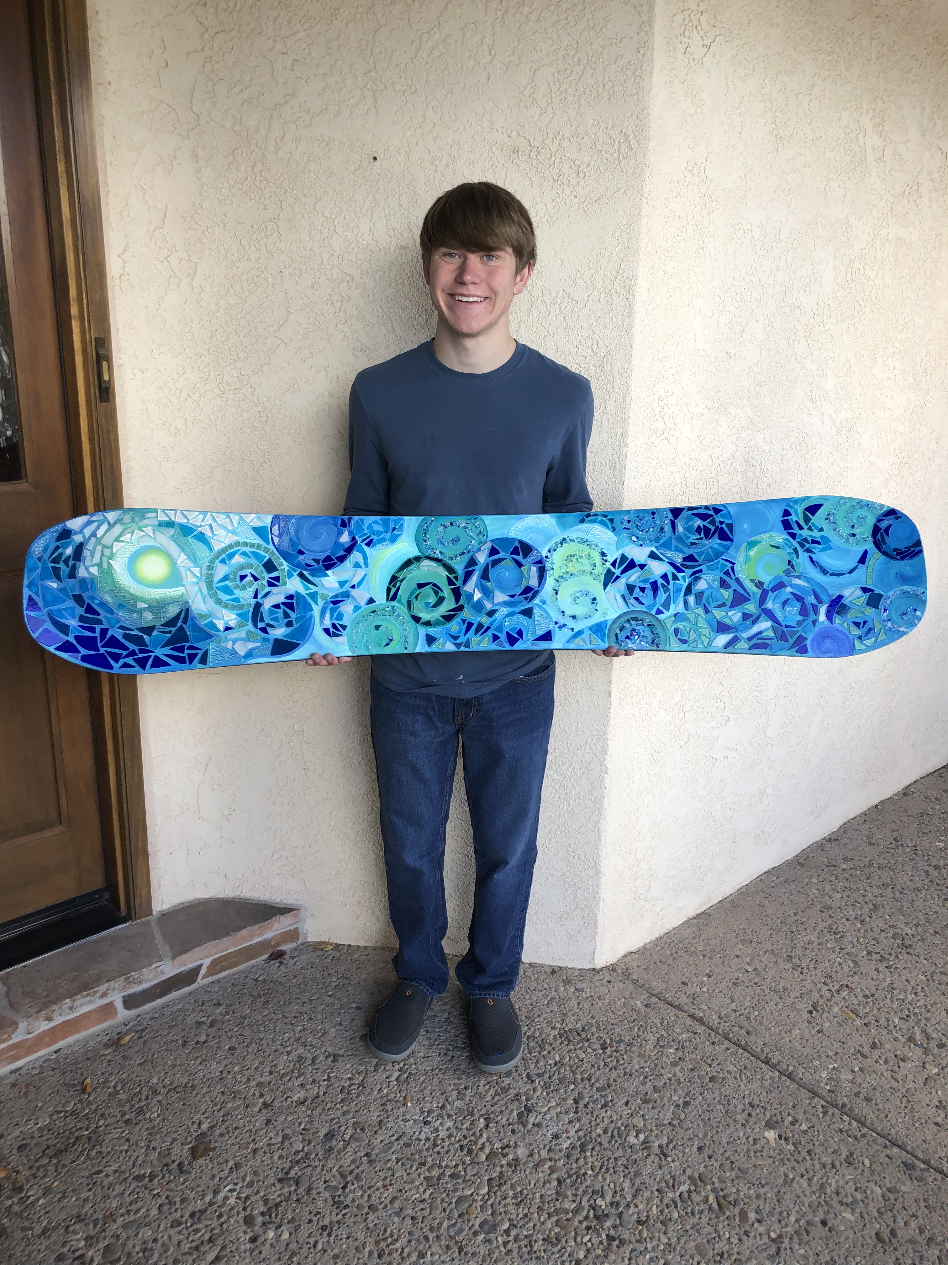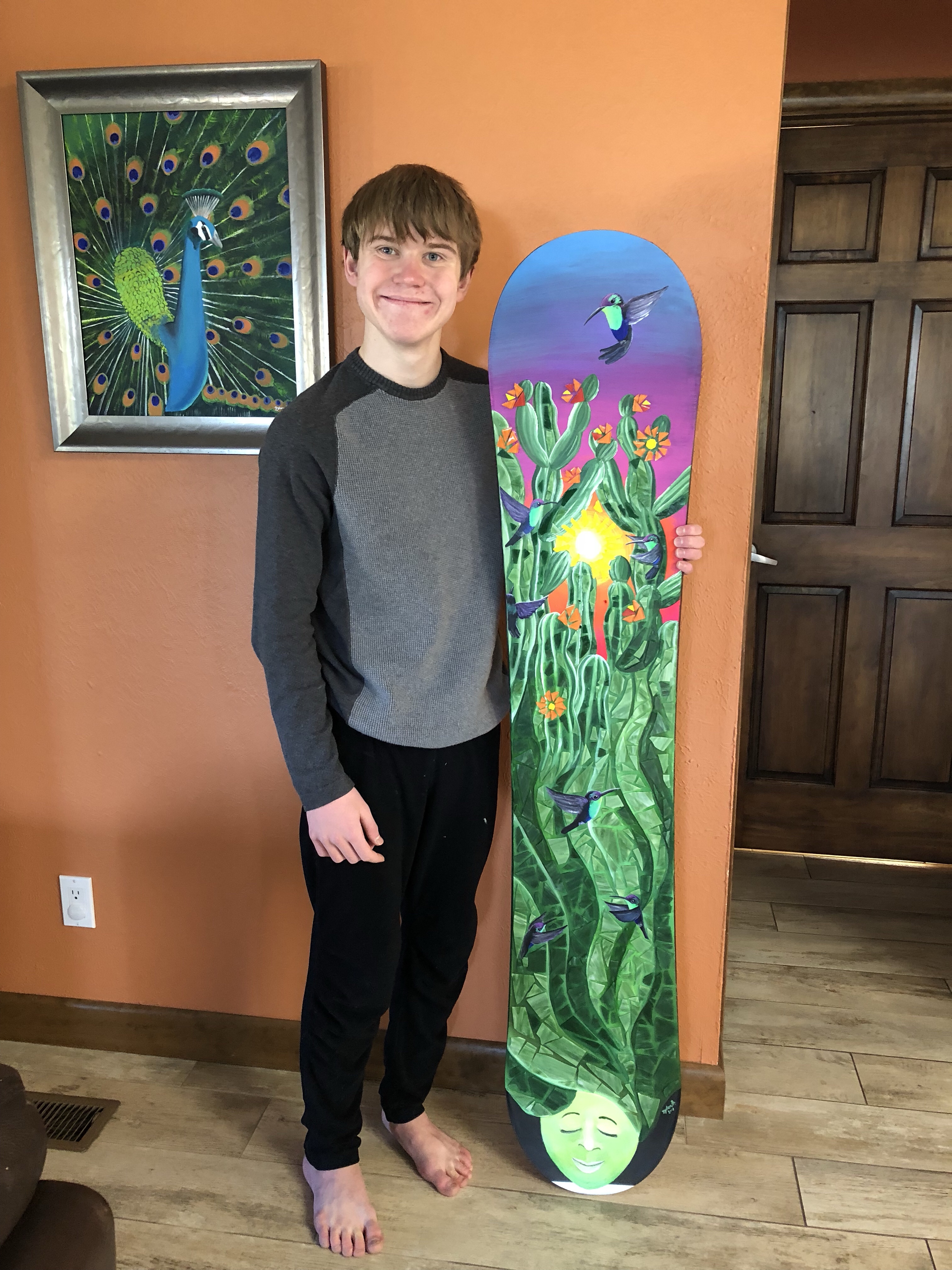 This is the fourth year that Dylan has painted a snowboard for the Paint for Peaks event in Taos Ski Valley which benefits breast cancer awareness and education.
