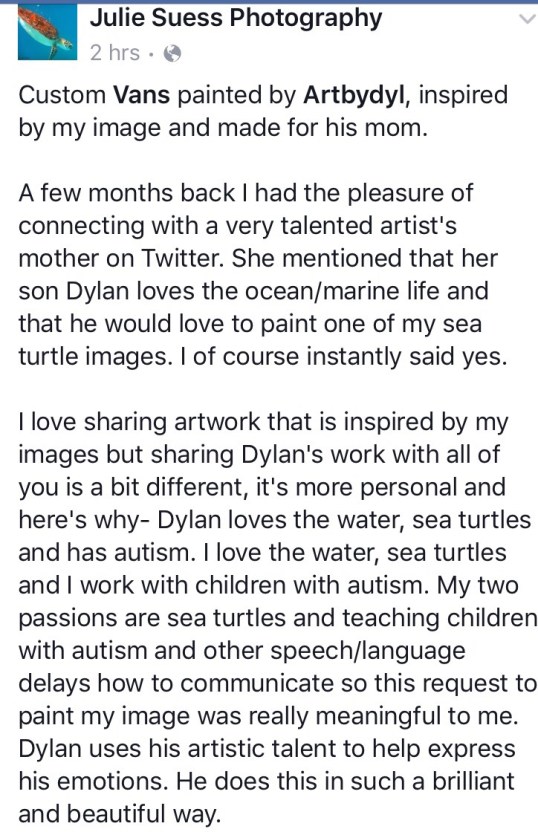 Sea Turtle Vans Posted on April 24, 2016 by artbydyl Dylan’s turtle shoes were inspired by Julie Suess Photography. He loves her turtles and watches the videos over and over. This was posted today on Facebook: Share this: Click to share on X (Opens in new window) X Click to share on Facebook (Opens in new window) Facebook Click to email a link to a friend (Opens in new window) Email Like Loading...